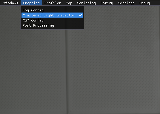 Graphics menu is the one needed. Upon pressing, four more buttons appear: Fog Config, Clustered Light Inspector, CSM Config and Post Processing. You need to choose the Clustered Light Inspector.